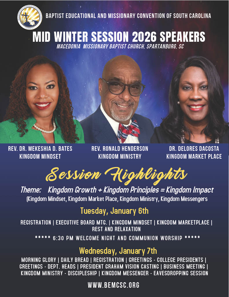 The Baptist Educational and Missionary Convention of South Carolina is hosting the Mid-Winter Session. Macedonia Missionary Baptist Church, Spartanburg, SC, January 6th and 7th.
